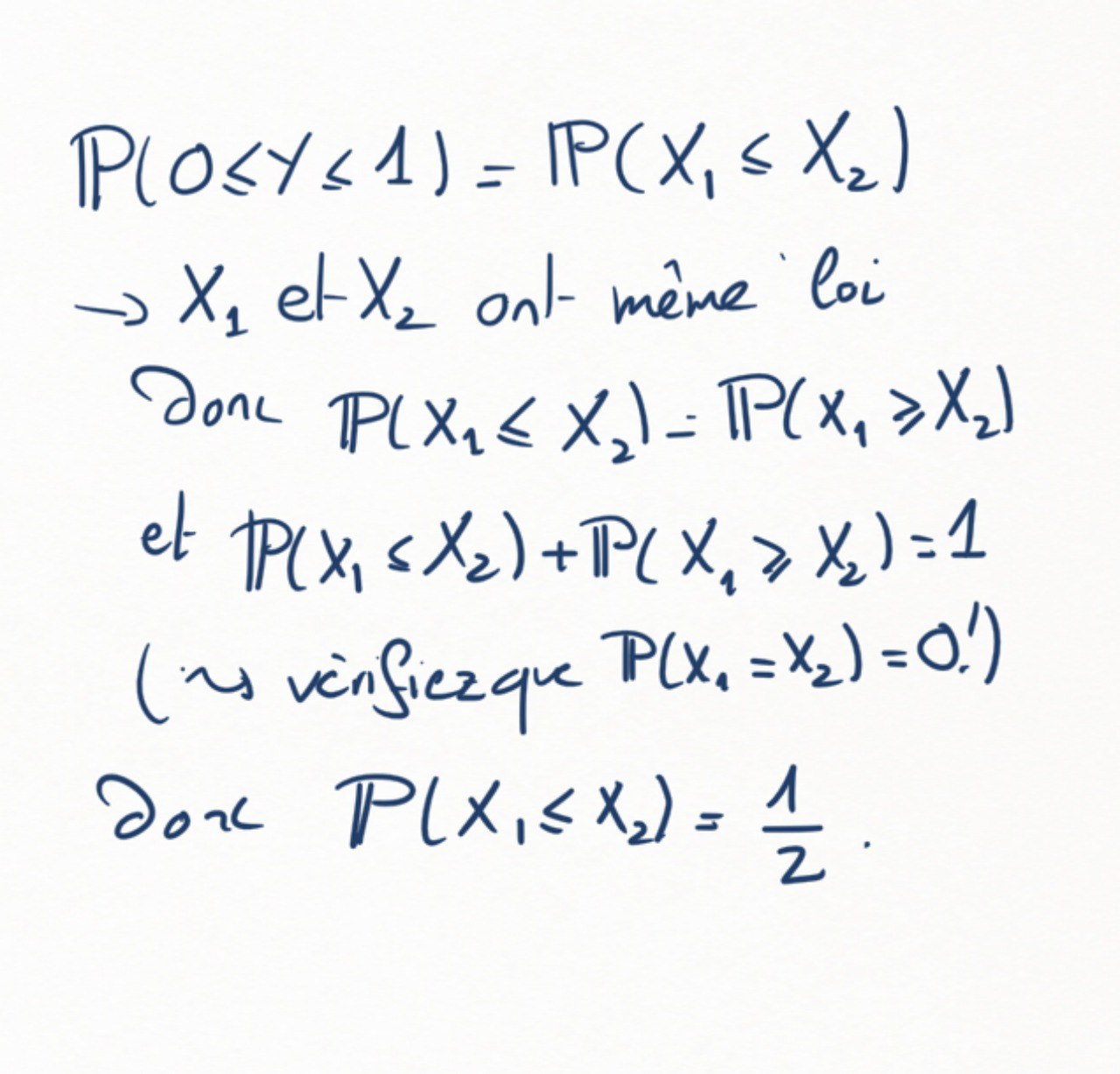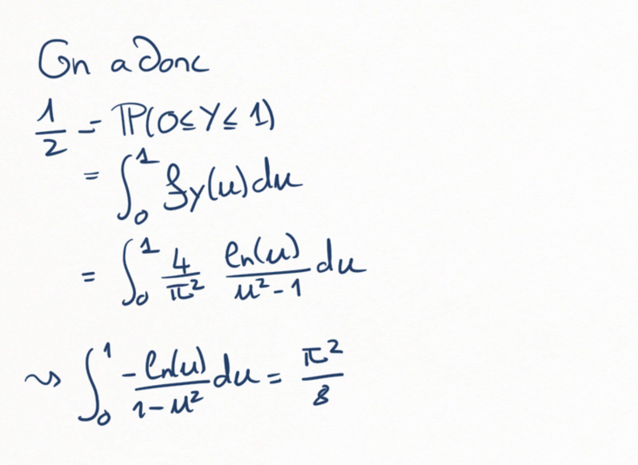 Justifier que \(\mathbb P(0\leq Y\leq 1) = \frac12\text{.}\) En déduire que