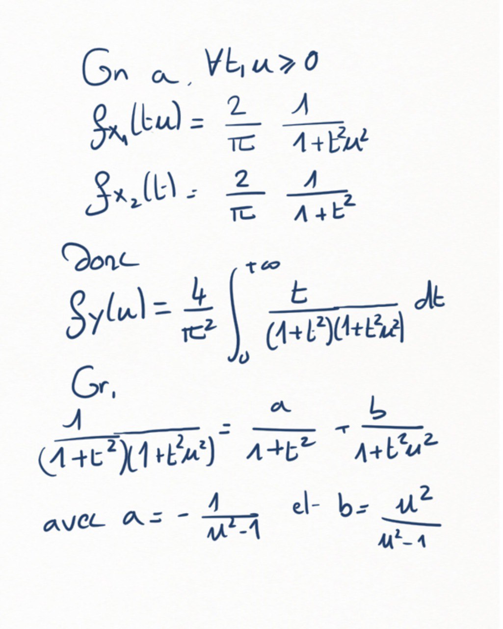 \frac1{1+t^2u^2}\frac1{1+t^2} = \frac{a}{1+t^2u^2}+\frac{b}{1+t^2}