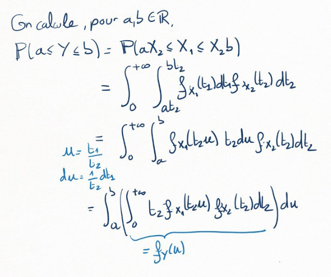 Posons \(Y=\frac{X_1}{X_2}\text{.}\) Montrer que la densité de \(Y\) est donnée par