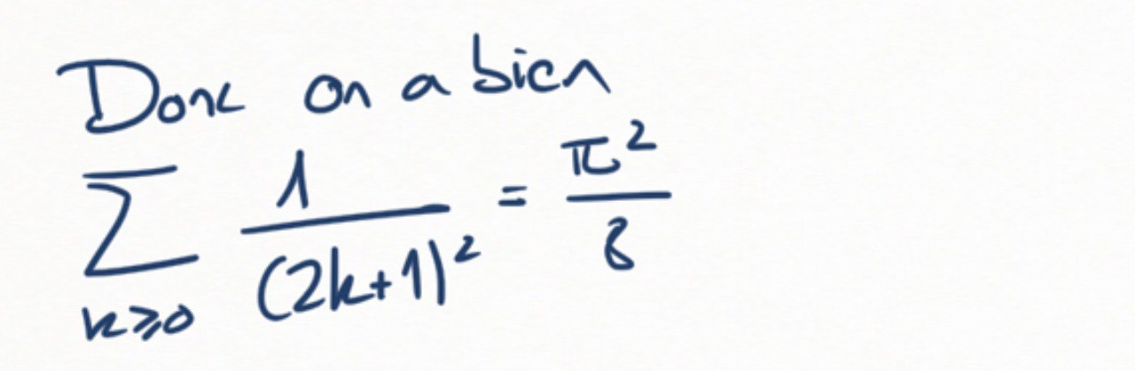 En séparant les entiers pairs et impairs, montrer que, en notant \(S=\sum_{n=1}^\infty \frac1{n^2}\text{,}\)