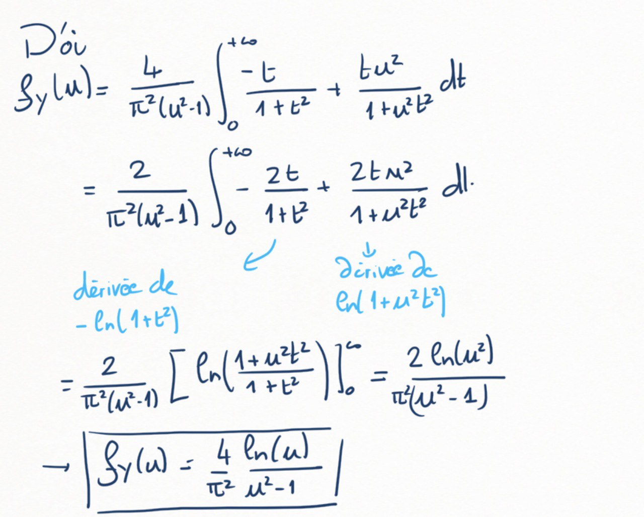 f_Y(u)=\frac{4}{\pi^2}\frac{\ln(u)}{u^2-1}