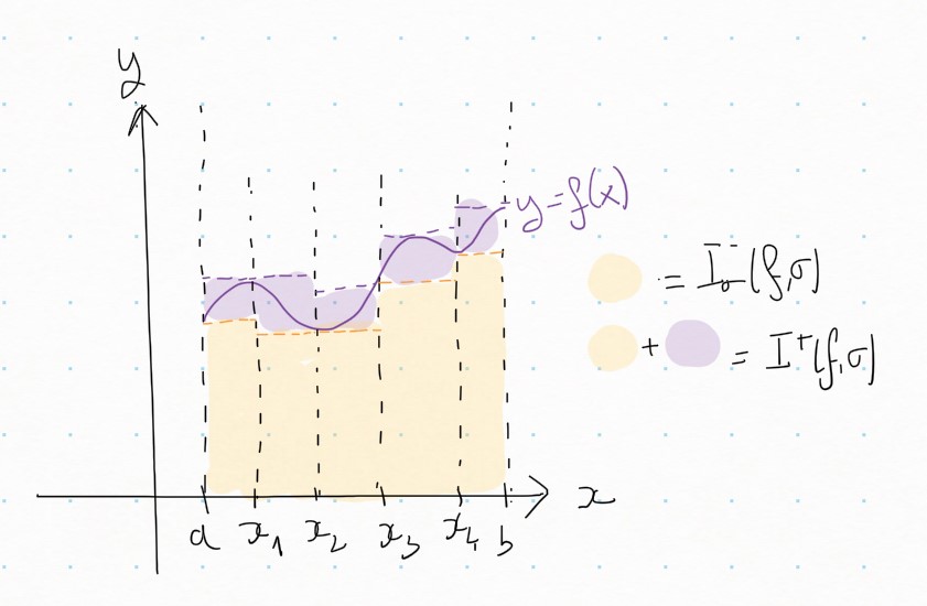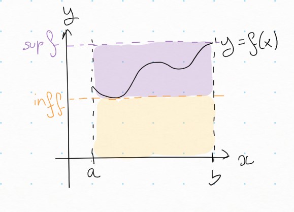 En grossissant suffisamment le trait, on s'aperçoit que l'analyse propose une méthode identique pour une immense variété de problèmes: approximer par quelque chose de plus simple, puis passer à la limite. Dans le cas du calcul d'aire, le plus simple, ce sont les rectangles (c'est-à-dire, les fonctions constantes). On commence donc par approcher la fonction \(f\) par une fonction constante: raisonnablement, celle qui approche le mieux \(f\text{,}\) soit par en-dessous (\(\inf_I f\)), soit par au-dessus (\(\sup_I f\)).